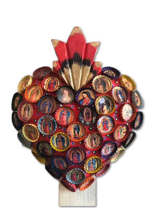 Innovative design. Hand painted wooden Sacred Heart affixed with over two dozen bottle caps, each with assorted Guadalupe images. An impressionab...