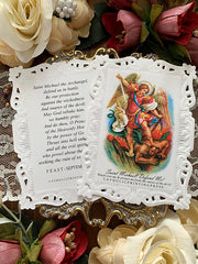 Traditional Catholic paper lace holy card featuring antique French artwork of St. Michael with the St. Michael prayer on the back