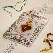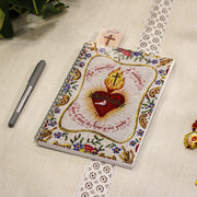 Image is from a turn-of-the-century, hand-painted French lace Holy Card crafted by Aubry, #186. The translation is featured on the back cover: "There in recollection and solitude in the Heart of Jesus I lose myself". A Full of Grace USA Original Product.