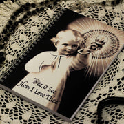 The black and white image depicts the Christ Child lifting up His Sacred Heart as it forms the shape of the Eucharist with a faint cross in the middle of the host. The simple caption: "See, O See How I Love Thee" speaks for itself. A Full of Grace USA Original Product. Image used with permission from: www.thewindowshowsitall.blogspot.com
