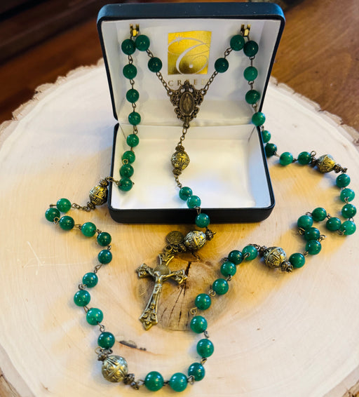 View full detailsThis beautiful green glass bead rosary features an Our Lady of Grace bronze centerpiece, unique bronze Our Father beads, a bronze Filigree Crucifix...