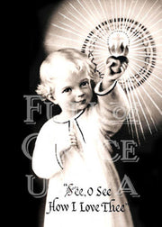 Glossy full-color print of the "See O' See How I Love Thee" image suitable for framing. The black and white image depicts the Christ Child lifting up His Sacred Heart as it forms the shape of the Eucharist with a faint cross in the middle of the host. The simple caption: "See, O See How I Love Thee" speaks for itself. A Full of Grace USA Original Product. Image used with permission from: www.thewindowshowsitall.blogspot.com