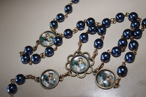 View full detailsThis beautiful blue glass pearl rosary features St. Christopher with the Child Jesus on each of the bronze Our Father medals and the bronze center...