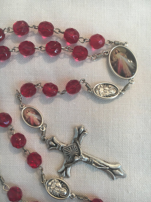 View full detailsThis beautiful ruby red Czeck-glass fire-polished bead rosary features the Divine Mercy image on the front and the 7 Sorrows on the back of each of...