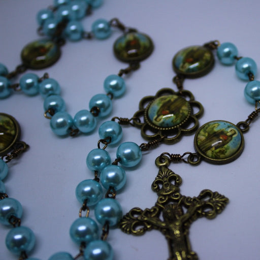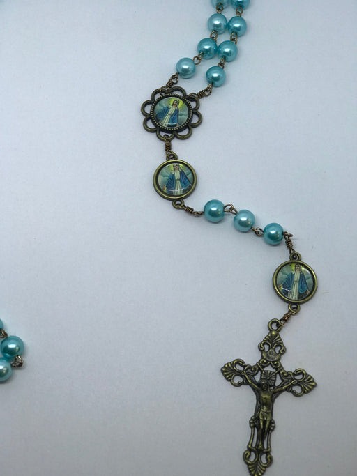 View full detailsThis beautiful teal pearl rosary features Our Lady of Grace on each of the bronze Our Father medals and the bronze centerpiece; includes a bronze F...