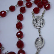 This beautiful ruby red Czeck-glass fire-polished bead rosary features the Divine Mercy image on the front and the 7 Sorrows on the back of each of the silver Our Father medals. The silver centerpiece has the Divine Mercy image and Christ crowned with Thorns on the back, as well as a silver Crucifix and silver wiring. The 8mm Aves are Czeck-fire-polished glass bead. A unique and beautiful hand-crafted rosary by Shannon in Colorado.