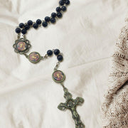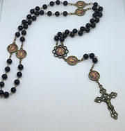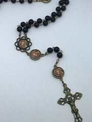 This beautiful black rosary features Our Lady of Perpetual Help on each of the bronze Our Father medals and the bronze centerpiece; includes a bronze Filigree Crucifix and bronze wiring. The 8mm Aves are black glass pearls. A unique and beautiful hand-crafted rosary by Shannon in Colorado.
