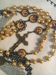 This beautiful golden-yellow glass pearl rosary features St. Claire on each of the bronze Our Father medals and the bronze centerpiece; includes a bronze Filigree Crucifix and bronze wiring. The 8mm Aves are golden-yellow coated glass pearls. A unique and beautiful hand-crafted rosary by Shannon in Colorado.