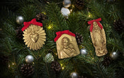 A truly unique addition for your family Christmas tree! Vintage Catholic Christmas ornaments are hand-poured in Colorado and decorated with a red satin ribbon and a tree hanger.