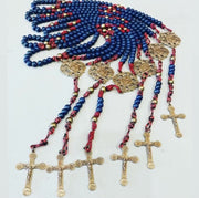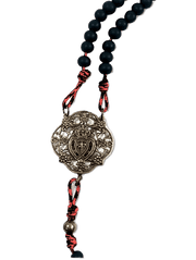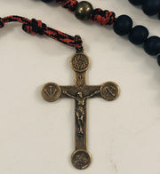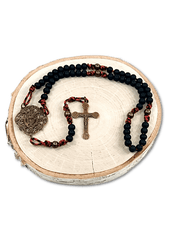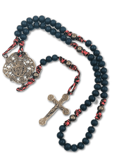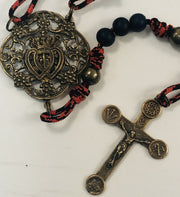 The Virgo Potens is a Rosary dedicated to the Blessed Virgin Mary. It is handcrafted using red and black Type 95 paracord. It is made with 8mm navy blue wooden beads on the decades and 8mm wooden bronze Pater beads. It features an amazing centerpiece representing the Triumph of the Immaculate Heart. The Sacred Heart of Jesus and the Immaculate Heart of Mary are crowned together side by side in a Fleur de Lis setting. It comes with an equally unique Crucifix of the Lamb of God with the tools of the crucifixion.